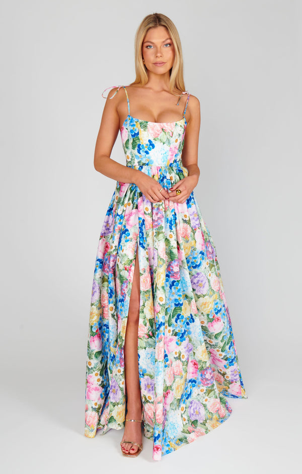 Robe maxi florale bleue éclatante pour femme - élégante robe longue pour événements spéciaux